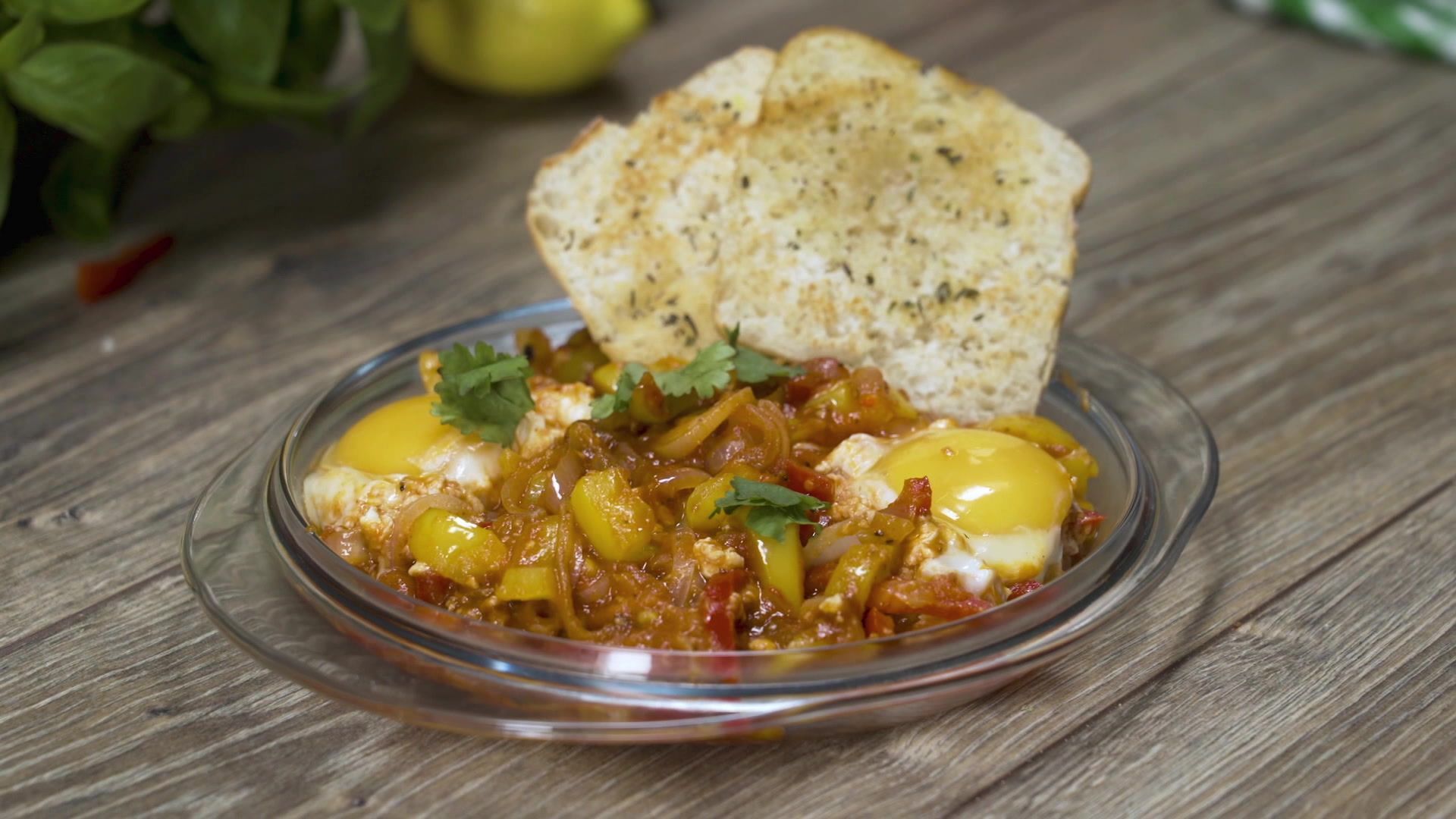 • Pour le dressage, disposer dans un bol, le chakchouka, ajouter des feuilles de coriandre sur le dessus ainsi que le pain.