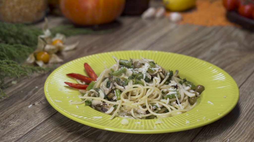 Aujourd’hui, nous allons préparer des spaghetti aux haricots verts et aux champignons. Pour cela, nous allons faire revenir dans une poêle, des olives, des champignons, des haricots verts, de la coriandre, du citron, de l’oignon et un bouillon de légumes. À cela, nous ajoutons des spaghetti avec un bon assaisonnement. Bon appétit !