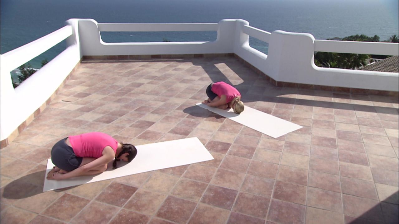 In this episode, we will show you how to relax and stretch your back by doing the child's pose. To do this, place your hands near your feet, which will stretch your shoulder blades. Breathe with your stomach and move your shoulders away from your ears. This exercise is perfect for relieving stress.